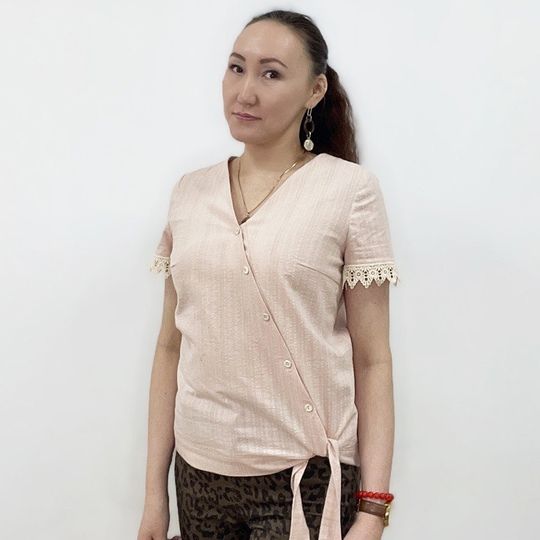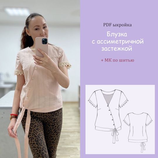 Электронная выкройка женской блузки с асимметричной застежкой на пуговицы, притачным поясом и короткими рукавами с тесьмой. PDF-файл для печати на А4, инструкция и пошаговый мастер-класс с фото.