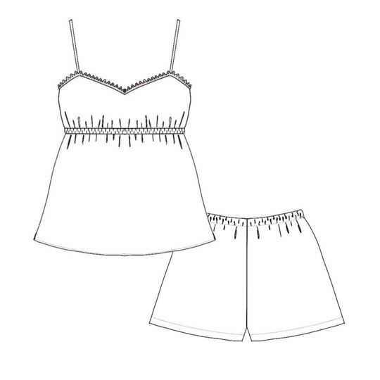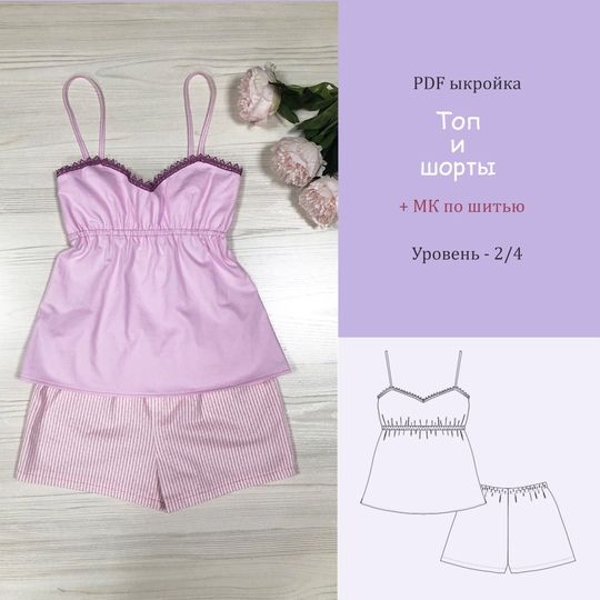 Создайте уютный и женственный комплект своими руками! Выкройка включает топ с отрезным лифом на бретельках и ажурным кружевом по верхнему краю, а также свободные шорты на резинке. Этот комплект идеально подойдет как для сна, так и для домашнего отдыха.