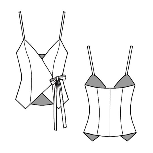 Электронная выкройка стильного женского жилета на бретелях с запАхом. Приталенный силуэт, рельефные швы, застежка на пуговицу и завязку. PDF-файл для печати на А4, инструкция и пошаговый мастер-класс с фото.